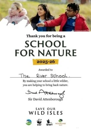 a Schools for Nature certificate signed by Sir David Attenborough, celebrating our commitment to wildlife and environmental care.